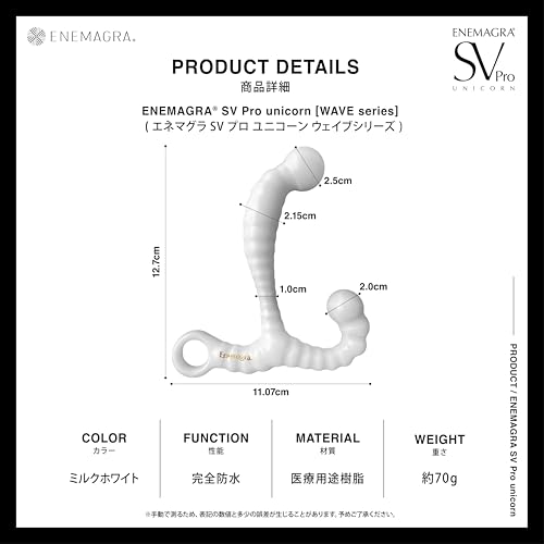 身体の奥深くの最高到達点、精嚢を刺激するエネマグラSV Pro unicorn全長約12.7cm、太さ約2.5cm、雲を想わせる瑞々しい質感の球体フォルムが身体に吸い付くように絡みつくため、簡単には逃げ出させてくれません。 締め付ければ締め付けるほど奥へと染み渡っていき、空に溶けていくような快感を体験できます。緩やかに脈打つシルエットが内側を優しく刺激するとともに、球状のヘッドが生み出す奥を押し広げ責め立てる愛撫によって内側から湧き上がる白い欲望を剥き出しにさせます。 滑らすでもなく摩擦する訳でもなく圧迫する。刺激が増す度身体の締め付けは強くなりSVの輪郭を感じられ、やがて理性は雲のように霧散します。「挿入して待つ」のではなく「挿入して探す」ことで、身体の内側と理性をかき乱されるような強い快楽を体験でき、前立腺への刺激とは異なる、新たな快楽の地平が見えてきます。精嚢刺激の他、従来のように前立腺刺激にも使用することもできるため、新しい快感と懐かしい充足感を味わうことができます。 心身の奥深くを刺激する快感の雲「エネマグラSV」は、貴方を快楽の旅に耽溺させます。※注意事項:エネマグラSVは、薬事法に規定された医療機器としてのバイブレーター、性具ではありません。直腸内、腸壁や精嚢、前立腺はデリケートな部位であるため、保護を行うためにも洗浄及び消毒のうえ、必ずコンドームの装着の上での使用をお願いします。基本的にアナルは伸縮性の高い部分ですが、人によっては指1本すら入れるのが痛いというケースもあります。ほぐしても痛いようなら、無理やり使用するのはやめてください。アナルが傷ついてしまう可能性があります。