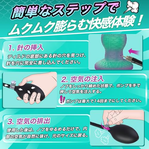 - 🛁【操作簡単+完全防水】 ポンプのチューブにある針をディルド底部の針穴に完全に差し込み、ノブを締めた状態で手でポンプを押して空気を注入する。理想のサイズまで膨らませたら、そのままお楽しみいただける。使用後はノブを緩めるだけで内部の空気が自然に抜け、元のサイズに戻る。🌟ポンプの押し回数は14回以内にしてください。 ディルドは高品質素材で作られており、肌に優しく、完全防水。お手入れも簡単で、使用後は水で洗い流し、表面の水分を拭き取り、自然乾燥させるだけでOK。