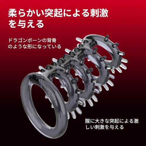 【粒子と棘 360°突起 5倍快感】柔らかいリアル肉質の360°突起抜き差し時、膣を絶妙に刺激し、快感を倍増させます。5つ360°突起は膣に強い刺激をもたらし、オーガズムの到着を早め、オーガズムによってもたらされる快感を高めることができます。【多重束縛 1つドラゴンボーンペニスリング=5つペニスリング】1つドラゴンボーンペニスリングは5つペニスリングがあります。多重のペニスリングのデザインを採用し、それぞれのリングには360度の突起があり、ペニスへの束縛感を高めると同時に脱落防止。【日本方々にぴったり】:全長130mm 直径24mm。日本方のサイズに合わせてデザインされた商品です。究極の快適さのための超伸縮性。柔らかいシリコーンは初心者と経験豊富な男性の両方にとって使いやすいです。【超弾力TPE素材】しなやかで柔軟性に優れたTPE製で、弾力があり、伸縮性も十分です。無毒、手触りは柔らかく、しっかりとした感触があり、気持ち良さが十分に感じられます。また、防水仕様と簡単なクリア方法、流れ水で洗いたら、すぐ綺麗になれます。【脱落防止設計・抜群の装着感】人間工学に基づいた設計で、激しくストロークしてもズレ落ちる心配がないのは大きなメリットです。フリーで簡単装着で付け心地は非常に良いで、圧迫感も適度で、ズレもありません。見た目よりも装着が容易で、装着後はグリップもしっかりしています。