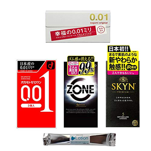- オカモトゼロワン(3個入)、サガミオリジナル0.01(5個入)、SKYN PREMIUM(5個入)、ZONE(6個入)の4箱セットです。