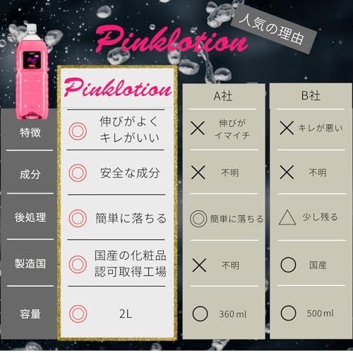 大人気のピンクローションに使いやすい2Lペットボトルが登場!いつものペットボトルだから取り扱いやすく人気です。ピンクは女性に優しいヒアルロン酸配合!ローションを使用した後のカサカサが気になる方は一度お試し下さい。とっても便利なお馴染みの2Lペットボトル入り!キャップを閉めれば外気をシャットアウト!保存も簡単。衛生的にも非常に優れておりますこのローションはハードタイプなので、約5倍に薄めてご使用頂けます。2L入りなので5倍に薄めるとなんと10L分!未開封で冷暗所に保管していれば3~4年は持ちます水道水で薄めてご使用の場合は、お早めに使い切る事をオススメします。またハードタイプの場合、お湯で希釈することにより、お手軽に温感ローションとしてお楽しみ頂けます。温かいローションは冬場はもちろんオールシーズン活躍します。ソフトタイプやミディアムタイプだと薄くなりすぎる場合もございますが、ハードタイプならガッツリ粘度がありますので、その心配はございません!このローションは日本製 化粧品認可取得工場製造品です!海外で大量生産されたローションとは違い、衛生管理を徹底した日本の化粧品工場で製作しております。直接デリケートな部分にも触れる物だからこそ、国産の高品質ローションをご利用下さい。またローション専用のラインで製造しておりますので、粘度のムラ、ローションが薄いなどのトラブルも心配ございません