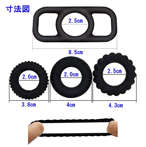 ペニスリング4点セット:Oリンクの3種類内径(20mm、20mm、25mm)+コックリング。ご自身のペニスサイズに合わせて好きなサイズを選択可能です。強伸縮性装着容易: 弾力性のある柔らかいシリコン素材で、高弾力性、脱着し易い、柔らかいシリコン素材を採用して、痛くない締め付け感です。安全耐久な素材:いりょう用シリコンを採用して、安全で、肌に優しいです。滑らかな肌触りは使っていてとても快適です。耐久性にも優れる素材です。巻き込み防止:Oリンクは一定の太さと硬さで巻き込みにくいタイプです。防水コンパクトタイプ:水で丸洗いでき、コンパクトなサイズで収納携帯便利です。品質保証:1年間