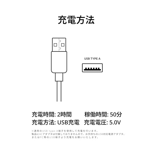 • 【静音設計 & USB 充電】 独自制御モーターで耳を澄ませても気になりにくい作動音。付属の USB Type-A ケーブルを本体端子に差し込むだけ。2 時間の充電で最長約 50 分使用可能。