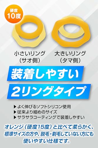 硬さ違いの2種類のリング シンプル形状のため装着しやすい 寸法は同じだが硬さが異なるためモノの大きさに応じて締め付け具合を調整できる 柔らかめなので締め付けも控えめになっていて 他の商品で圧迫感を感じていた人でも受け入れやすそう 効果の程は…よく分からないが マンネリ解消のアクセントとして捉えてもよいかも。光るし。