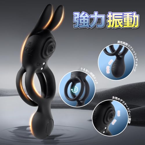 【カップル向け!2人イキ快感!】特別なウサギ型リング設計で、後部脱落防止設計です。ふたり同時にセ〇クス快感を得るために、デザインされたペニスリングです。ペ〇スを刺激しながら、同時にクリトリスを刺激したり、男女とも満足させ、クライマックスを盛り上げる最高のラブグッズです。【多彩な9種類振動モード】:ワンボタンで9種類の振動モードを自由に切り替えることができ、微妙な振動から強烈な振動まで、多彩なパターンがあり様々な刺激を与えることができます。ご自身でも、パートナーと一緒でも、楽しむことができます!【締め付け良好!装着感抜群!!】高品質シリコンで伸縮性が良く、やさしくもしっかりとした締め付け感です。内径が約32mmで、根元まで違和感なく使いやすいタイプ。長く楽しめます。【Wリングで締付け、安定感最高】シングルリングと比較して、このコックリングは、2重リングがあり、竿と玉をしっかりと締め付け、ストローク中に安定した快感を実現してくれ、いつでも集中してプレイに楽しめます。【防水・USB充電・日本男性向けサイズ】お風呂場や水の中でも楽しめ、使用後も防水なので丸洗いできて便利です。手のひらサイズなので実家暮らしでもこっそり気持ちよくなれます。
